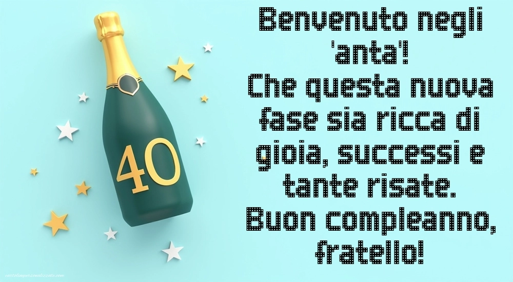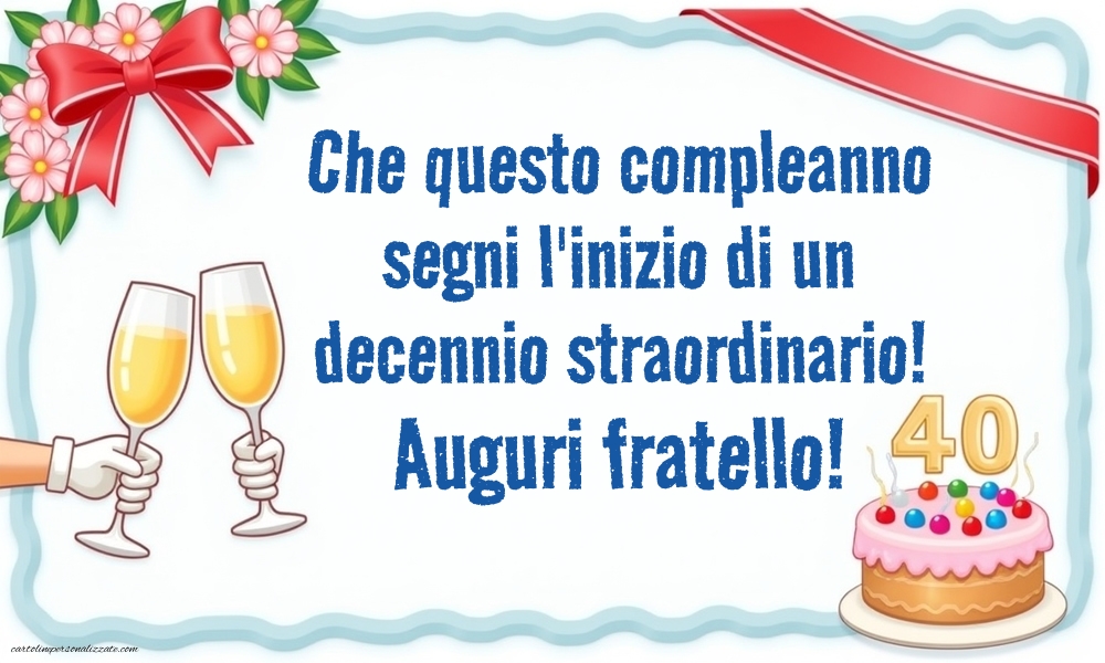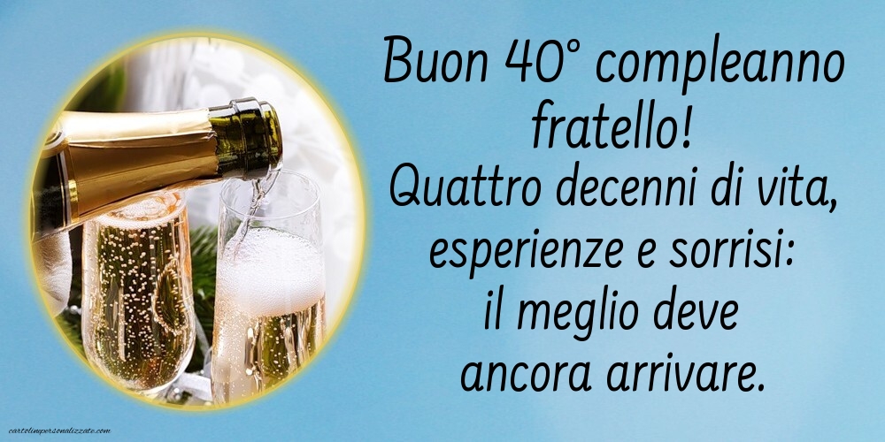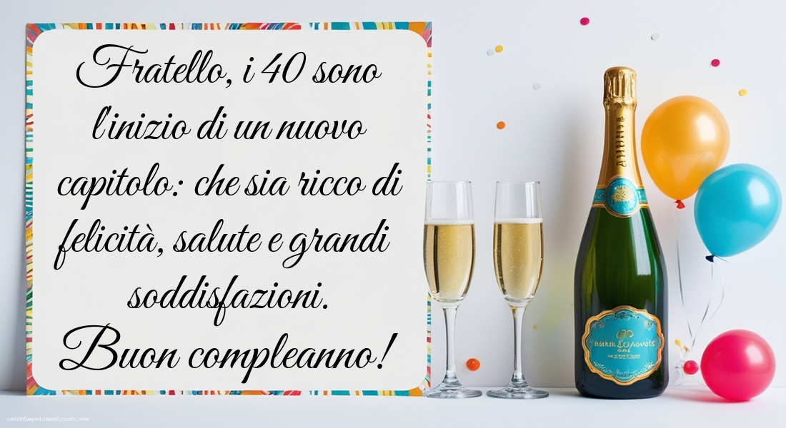 Il 40° compleanno è un momento importante e merita di essere festeggiato con gioia e affetto. Se il tuo fratello compie 40 anni, sorprendilo con un’immagine di buon compleanno che trasmetta il tuo affetto e la tua vicinanza. In questa pagina troverai una selezione di immagini di buon compleanno per fratelli che compiono 40 anni ⭐, tra messaggi divertenti, affettuosi e originali, perfette da condividere su WhatsApp, social o da accompagnare a un regalo speciale. Festeggia questo traguardo unico con un augurio che renderà il suo giorno ancora più speciale.