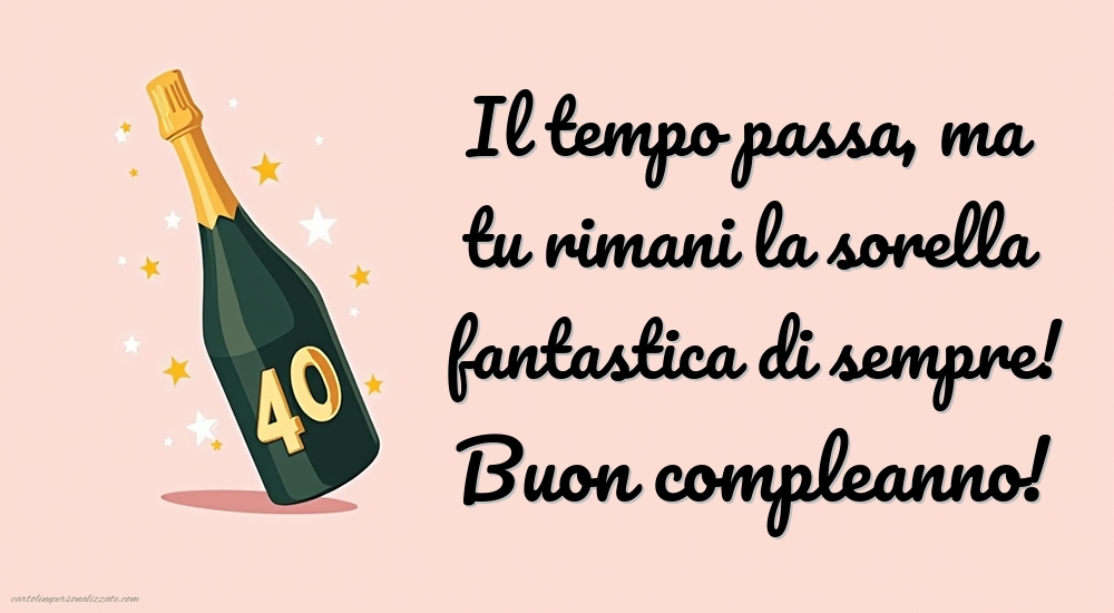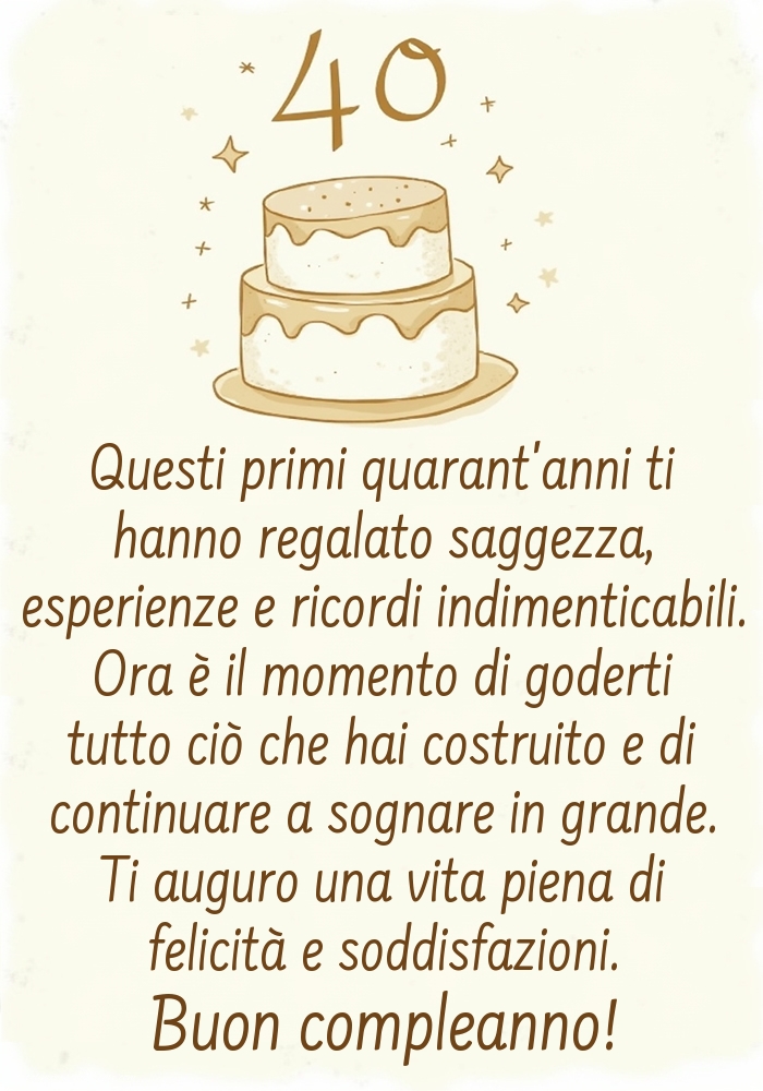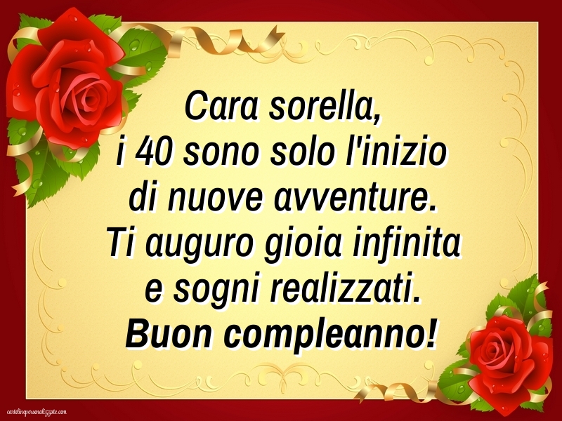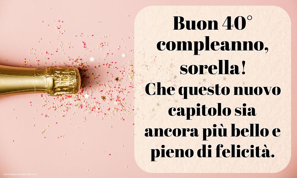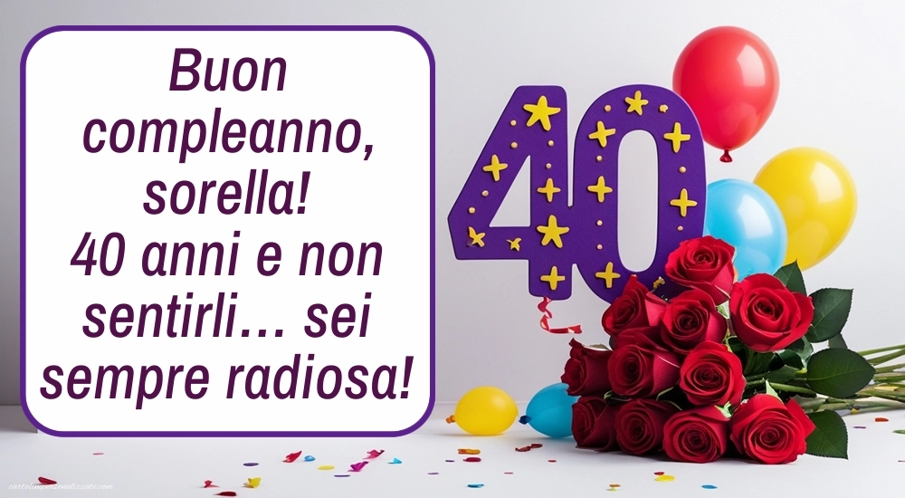 Il 40° compleanno è un momento speciale nella vita di una donna e merita di essere celebrato con gioia e affetto. Se la tua sorella compie 40 anni, sorprendila con un’immagine di buon compleanno che esprima tutto il tuo amore e la tua vicinanza. In questa pagina troverai una selezione di immagini di buon compleanno per sorelle che compiono 40 anni ⭐, tra messaggi divertenti, affettuosi e originali, perfette da condividere su WhatsApp, social o da stampare insieme a un regalo. Festeggia insieme a lei questo traguardo speciale con un augurio unico che resterà nel cuore.