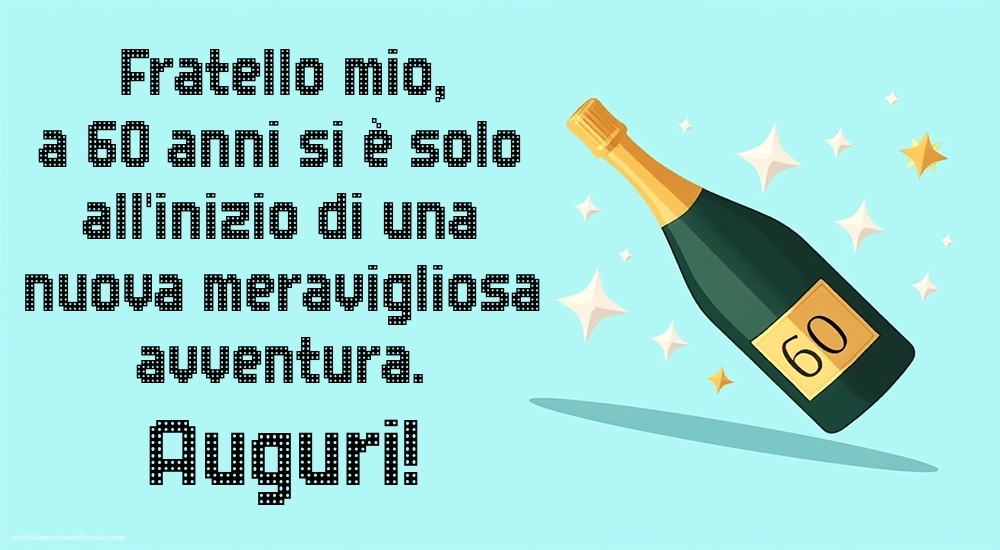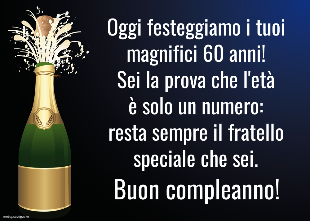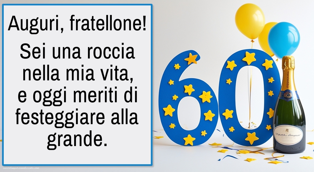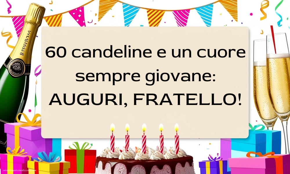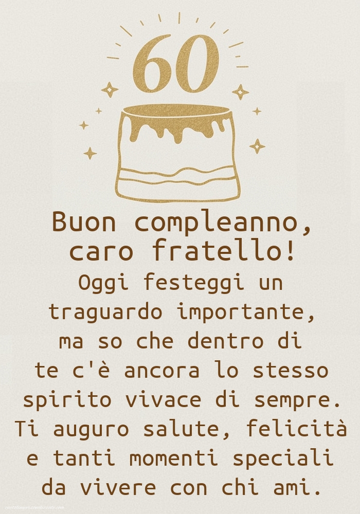 Compiere 60 anni è un traguardo importante, e festeggiarlo con un fratello lo rende ancora più speciale. Per questa occasione unica abbiamo selezionato una raccolta di immagini di buon compleanno per un fratello di 60 anni ⭐, perfette per condividere affetto, gioia e un pizzico di divertimento. Troverai cartoline virtuali eleganti, immagini allegre con frasi affettuose e foto originali che celebrano la vita e i ricordi. Che tu voglia un’immagine simpatica per strappargli un sorriso o una più emozionante per rendergli omaggio, qui troverai l’idea giusta.