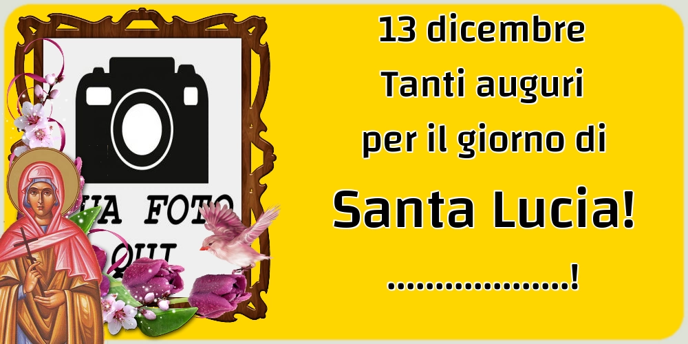 L'immagine di Santa Lucia con 1 Foto e il messaggio 13 dicembre Tanti auguri per il giorno di Santa Lucia! ...! è personalizzabile con nome e foto e ha le dimensioni 1000px x 500px.