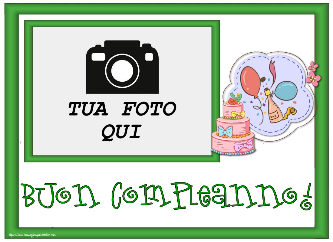 L'immagine per Bambini con disegno con torta, champagne, palloncini e il testo Buon Compleanno! - Cornice foto è personalizzabile con foto e ha le dimensioni 1100px x 800px.