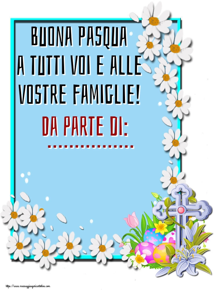 Cartolina personalizzata con uova, fiori e croce dalla categoria biglietti di Pasqua con nome e ha il testo Buona Pasqua a tutti voi e alle vostre famiglie! Da parte di: .... Crea questa cartolina con il nome che desideri in meno di 1 minuto!