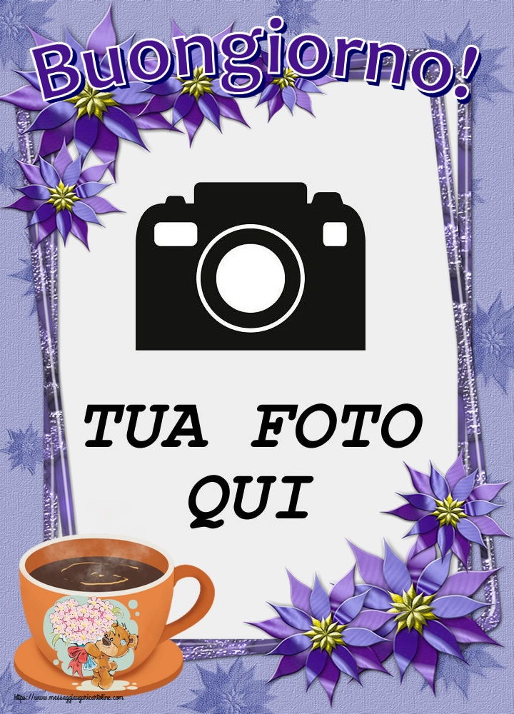 L'immagine di buongiorno con tazza da caffè con Teddy e il testo Buongiorno! - Cornice foto è personalizzabile con foto e ha le dimensioni 720px x 1000px.
