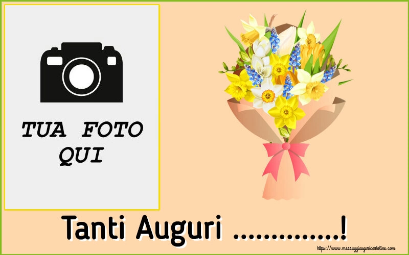 L'immagine di auguri con fiori gialli, bianchi e blu e il messaggio Tanti Auguri ...! - Cornice foto è personalizzabile con nome e foto e ha le dimensioni 800px x 500px.