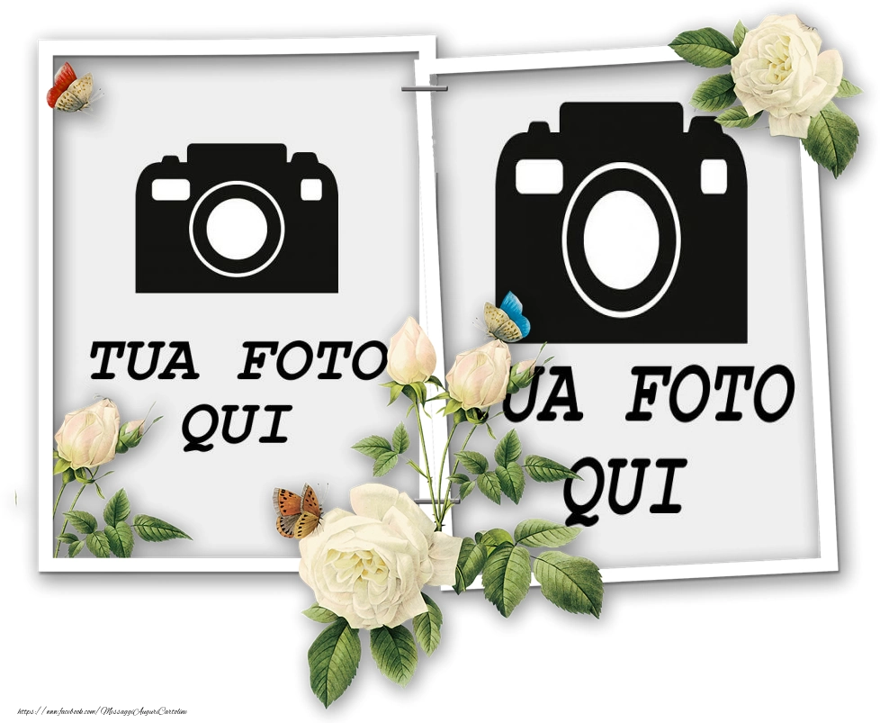 Questa immagine con cornice con rose bianche e farfalle colorate può essere personalizzata online gratuitamente con le tue fotos.