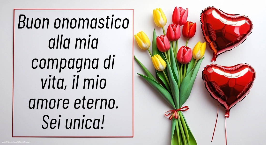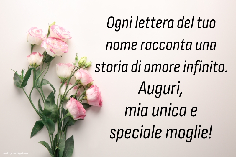 L’onomastico della moglie ⭐ è un’occasione unica per dimostrarle amore, gratitudine e affetto sincero. Le immagini di auguri di buon onomastico per la moglie sono il modo perfetto per sorprenderla con un pensiero romantico e renderla felice nel giorno del suo nome. In questa pagina troverai una raccolta di immagini arricchite con frasi dolci, romantiche e originali, ideali da condividere con la persona che ami. Potrai inviarle su WhatsApp, Facebook, Instagram oppure stamparle in un biglietto speciale per accompagnare un regalo. Che tu scelga un’immagine elegante, tenera o divertente, ogni augurio sarà un gesto che rafforzerà il vostro legame e renderà indimenticabile l’onomastico della tua moglie.