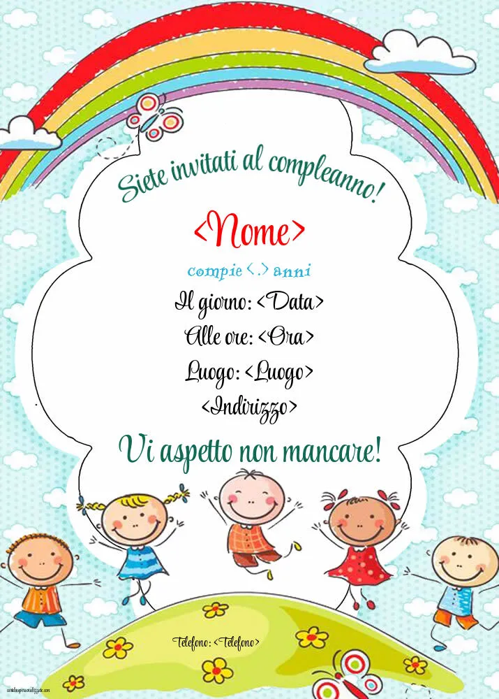 L'invito di compleanno per bambini con arcobaleno, nuvole, farfalle nel cielo e bambini alla festa può essere modificato online gratuitamente e misura 715px x 1000px.