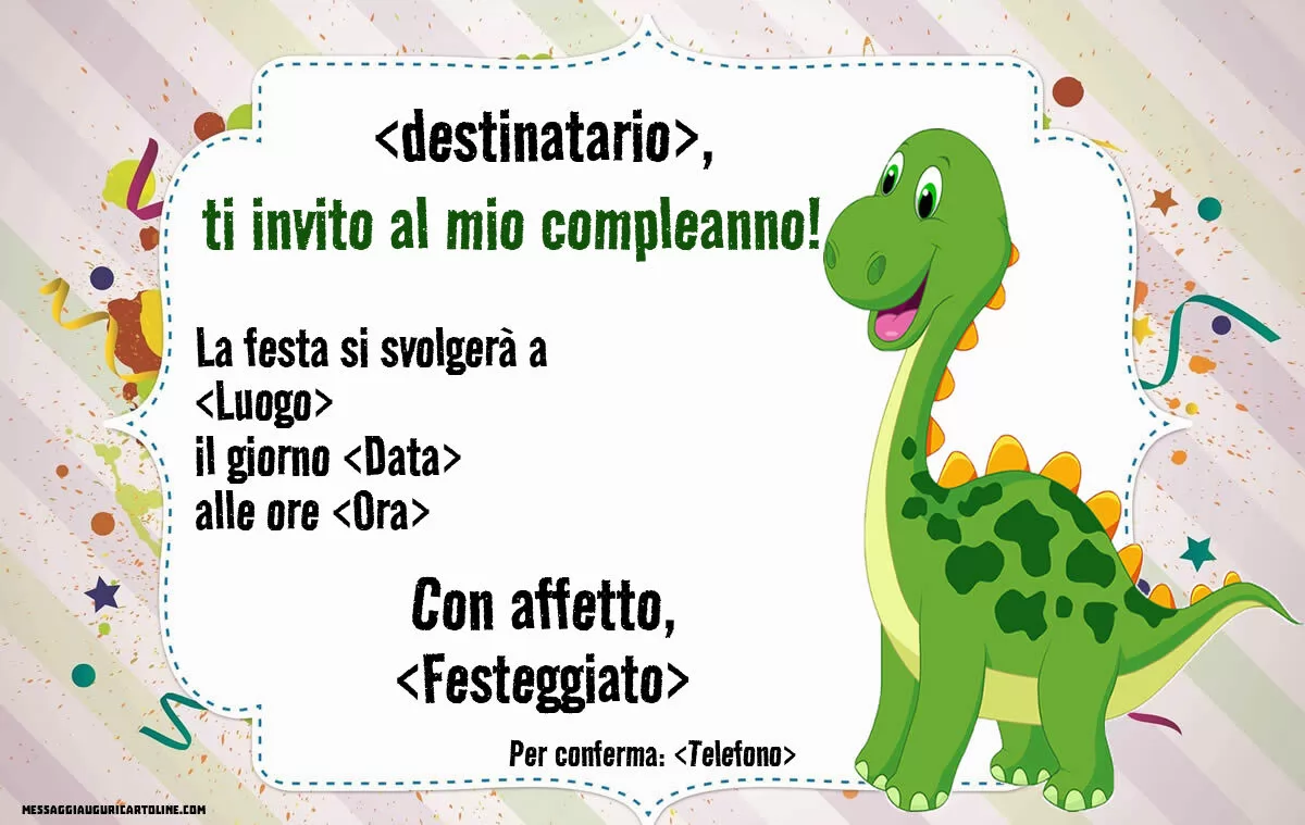 Si avvicina il compleanno di tuo figlio e non sai come invitare i suoi amici alla festa in modo originale? In meno di due minuti puoi personalizzare questo invito per bambini con un simpatico dinosauro online. In questo modo risolvi rapidamente l'invito e guadagni tempo per organizzare la festa!