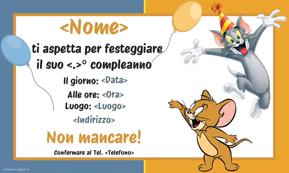 Questo invito non è solo un semplice annuncio, ma una piccola anticipazione dell'allegria di Tom e Jerry: colorato, vivace e pensato per far entrare ogni bambino nello spirito giocoso del grande giorno del festeggiato.