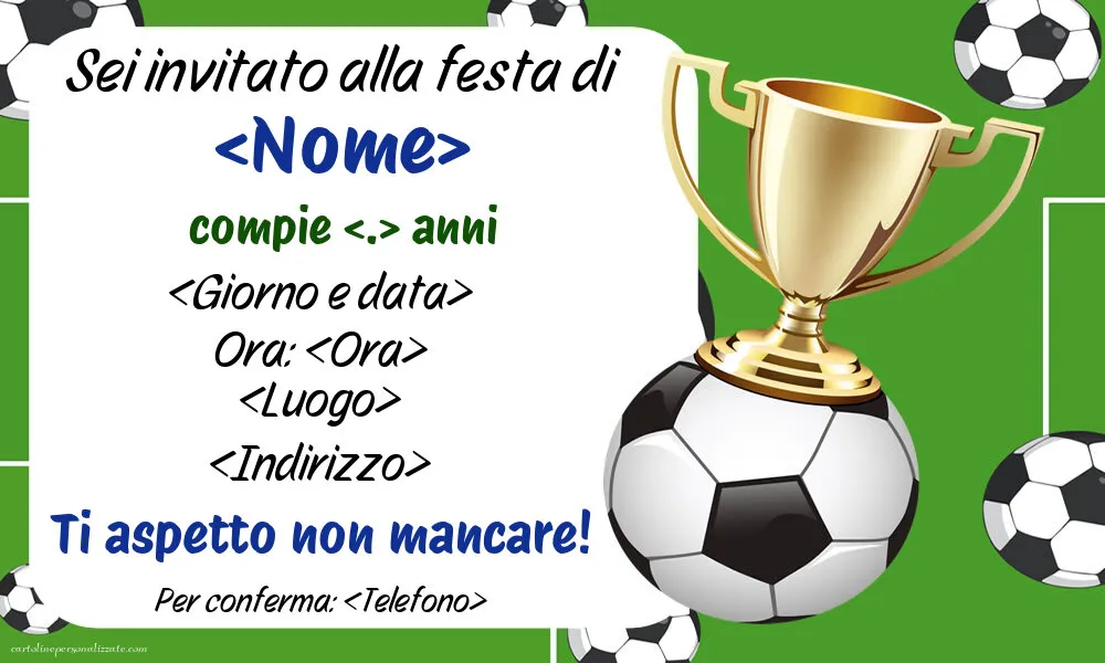 Si avvicina il compleanno di tuo figlio e cerchi un modo originale, sportivo e divertente per invitare i suoi amici alla festa? Questo invito per bambini con tema calcio è perfetto per tutti i piccoli appassionati di pallone. Con un design energico e dinamico, renderà l'annuncio della festa ancora più coinvolgente e pieno di entusiasmo!