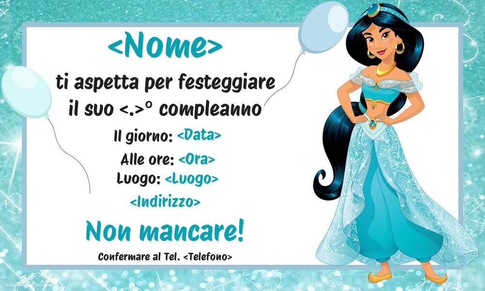 L'atmosfera fiabesca ispirata a Jasmine cattura immediatamente l'attenzione e rende l'invito perfetto per una celebrazione piena di allegria e fantasia.
