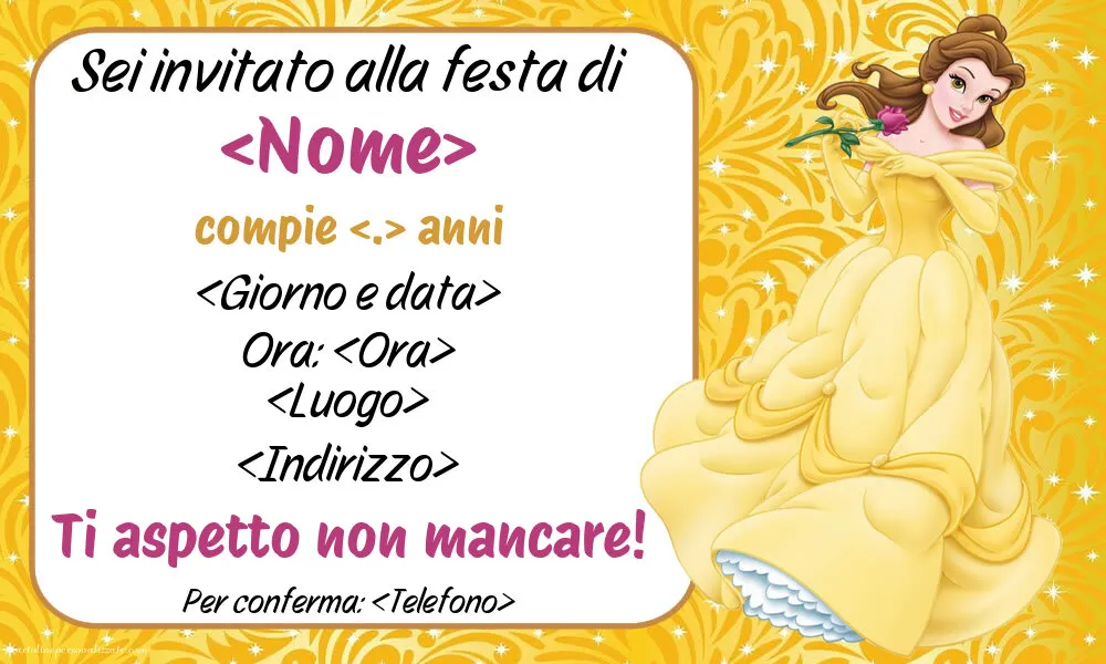 Il modello dell'invito, decorato con Belle e studiato per le piccole appassionate delle principesse, ha le dimensioni di 1000px x 600px ed è progettato per offrire un'ottima qualità sia nella versione digitale sia nella stampa. Una volta conclusa la personalizzazione, puoi scegliere se stamparlo, scaricarlo gratuitamente oppure condividerlo con un semplice clic tramite WhatsApp, Facebook, Twitter o Pinterest. In questo modo, gli inviti arriveranno subito agli amici della tua bambina, rendendo tutto il processo rapido, comodo e privo di stress.