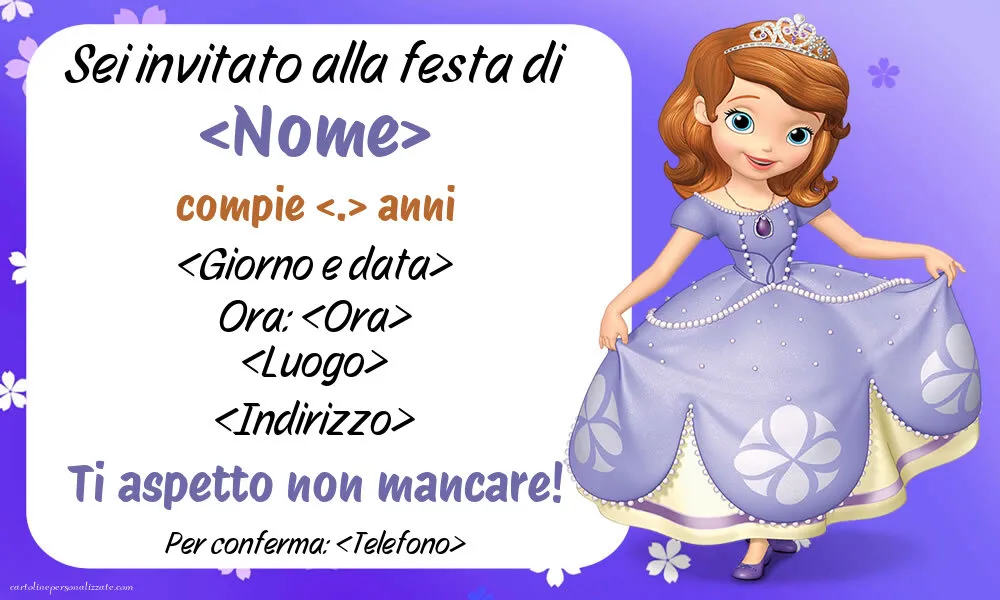 Questo invito per bambine con Sofia è perfetto per tutte le piccole fan della principessa dal cuore gentile. Con un design fiabesco e delicato, renderà l'annuncio della festa ancora più speciale e incantato!