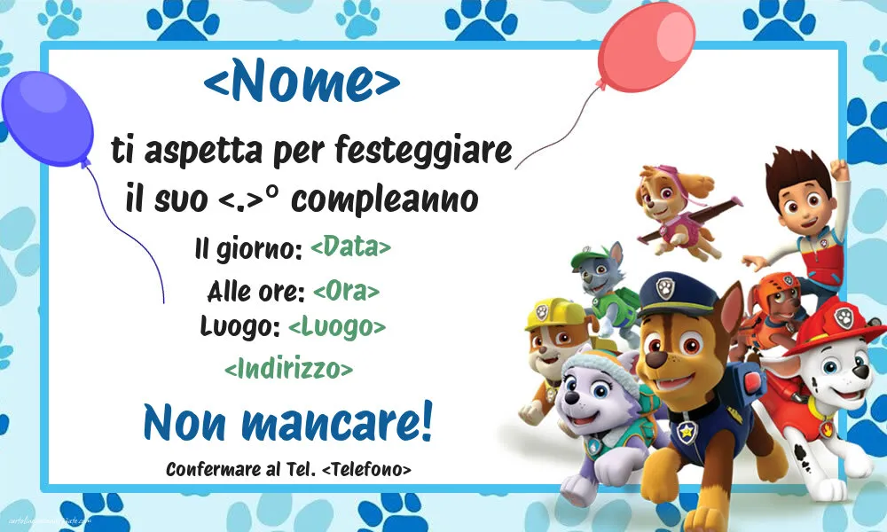 Si avvicina il compleanno di tuo figlio e vuoi trovare un modo originale e allegro per invitare i suoi amici alla festa? Se il tuo bambino ama le avventure a quattro zampe dei Paw Patrol, questo invito personalizzabile è la soluzione perfetta per annunciare la festa in modo divertente e colorato. In meno di due minuti puoi creare un invito unico, decorato con i personaggi preferiti e palloncini vivaci, capace di entusiasmare subito tutti i piccoli invitati!