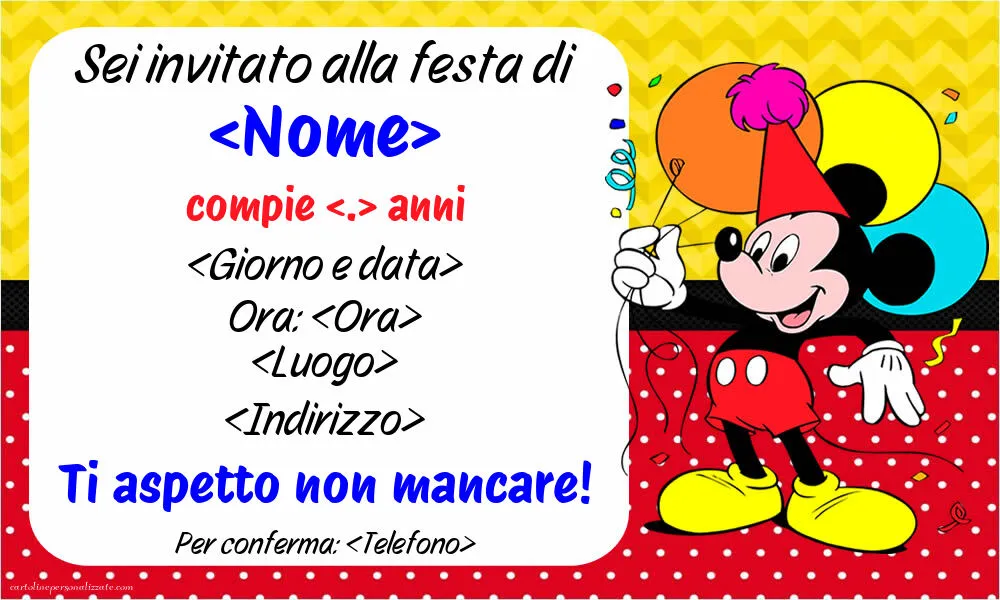 Con i suoi colori vivaci e l'inconfondibile sorriso di Topolino, l'invito trasmette immediatamente un'atmosfera festosa e invita grandi e piccoli a partecipare a una celebrazione ricca di gioia.