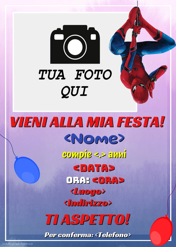 Stai organizzando il compleanno di tuo figlio e cerchi un modo dinamico, originale e davvero sorprendente per invitare i suoi amici alla festa? Questo invito di compleanno per bambini a tema Spiderman, con la possibilità di inserire anche la foto del festeggiato, è la soluzione ideale per trasformare l'annuncio della festa in qualcosa di unico ed emozionante. L'energia del celebre supereroe Marvel, unita ai colori forti e ai dettagli in stile fumetto, rende l'invito perfetto per tutti i piccoli fan dell'Uomo Ragno.