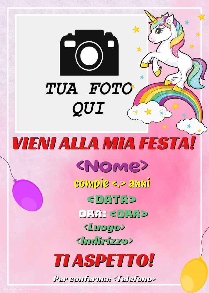 Se stai cercando un modo originale, creativo e divertente per far sapere ai suoi amici che una festa magica è in arrivo, questo invito personalizzabile con un unicorno e la foto della festeggiata è la soluzione perfetta.