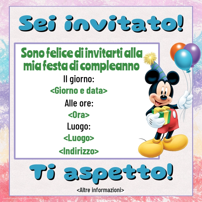 Si avvicina il compleanno di tuo figlio e stai cercando un modo originale e divertente per invitare i suoi amici alla festa? Con questo invito per bambini a tema Topolino puoi creare in meno di due minuti un messaggio personalizzato, semplice da modificare e perfetto per dare un tocco speciale al suo grande giorno! Ti basta inserire le informazioni principali della festa e l'invito sarà subito pronto da condividere.