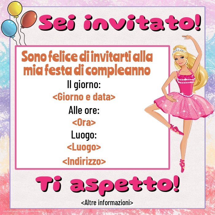 Si avvicina il compleanno di tua figlia e stai cercando un modo originale e creativo per invitare le sue amiche alla festa? Con questo invito per bambine a tema Barbie puoi personalizzare in meno di due minuti un messaggio unico, semplice da modificare e perfetto per rendere speciale il suo grande giorno! Ti basta inserire le informazioni principali della festa e l'invito sarà subito pronto da condividere.